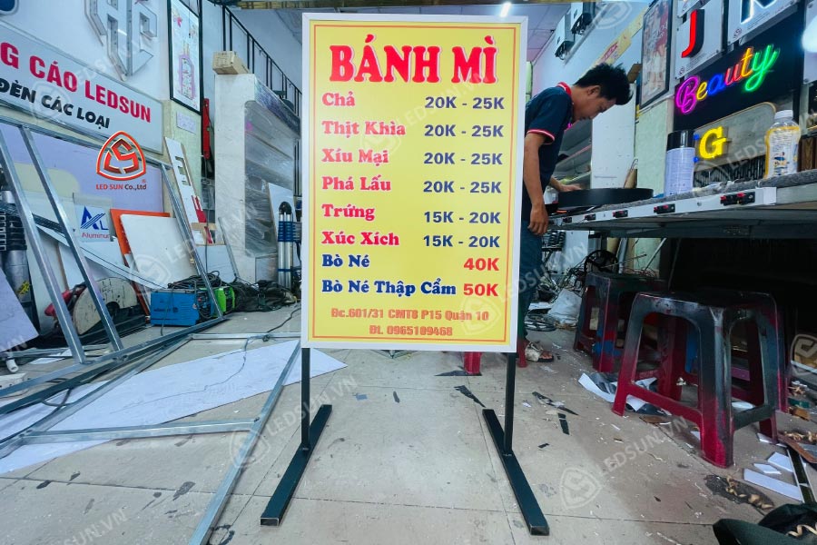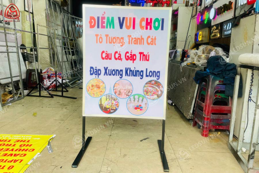 Biển bạt 2 mặt có chân là một loại biển quảng cáo phổ biến, thường được sử dụng trước các cửa hàng, quán ăn, tiệm tóc, tiệm tạp hóa,… với mục đích thu hút sự chú ý từ cả hai hướng người đi đường.