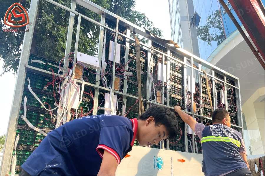 Tiến hành lắp đặt khung và treo màn hình theo đúng bản vẽ kỹ thuật, đảm bảo độ phẳng, độ chắc chắn và an toàn điện trong suốt quá trình thi công và sử dụng.